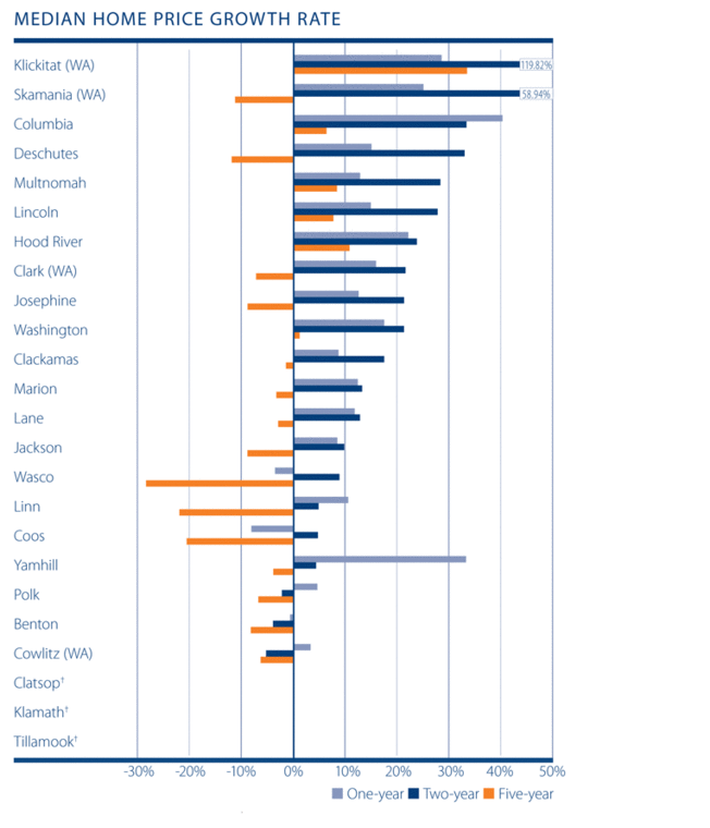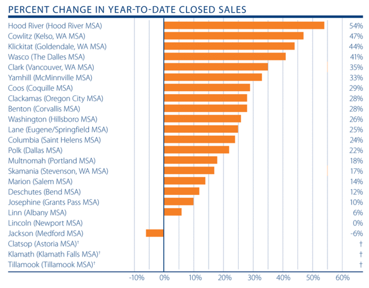 The greatest growth in home sales was again seen in Hood River County (+54%), and this was followed by Cowlitz (+47%), Klickitat (+44%), and Wasco (+41%) Counties. Of the counties that saw home sales increase, only one—Linn—did not see double-digit growth (+6%).