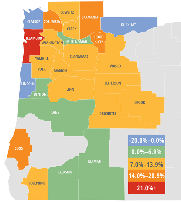 - Tillamook County led the market with the strongest annual price growth. Homes there sold for 22.5% more than a year ago.