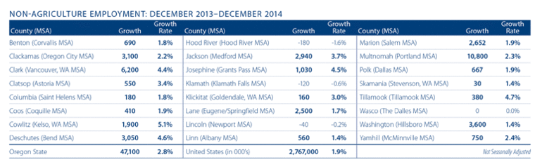 Job growth in the Oregon market areas contained in this report continues to pick up steam with a total of 41,809 jobs added in 2014 —this represents an annual growth rate of 2.4 percent. In the fourth quarter alone, 14,833 jobs were added to the economy.