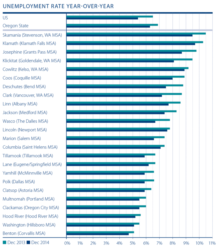 As I stated in my last report, given the improving job market seen in 2014, it is not surprising to see the unemployment rate continuing to drop in every county discussed in this report. The lowest unemployment rate was in Benton County at 4.7 percent, and the highest in Klamath County, where 9.7 percent of the labor force was out of work.
