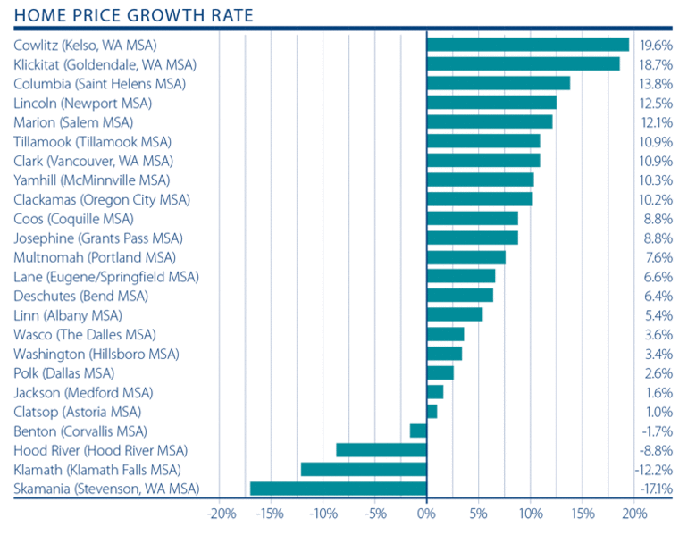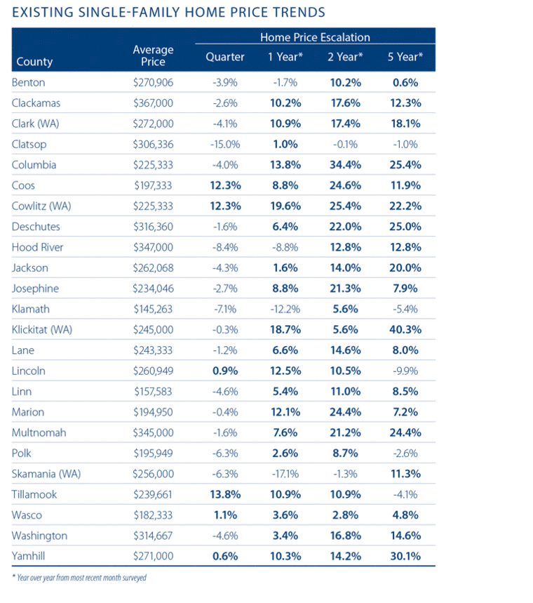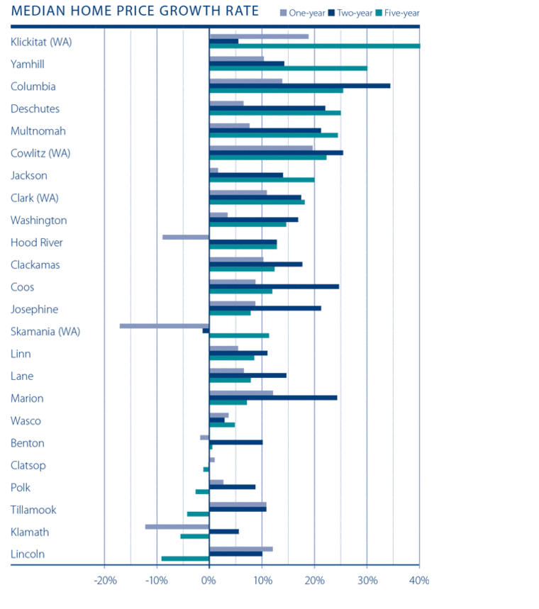 Interestingly, home prices in all but two counties (Clatsop and Skamania) are higher than seen two years ago and all but five counties have seen prices appreciate over the past five-year period.