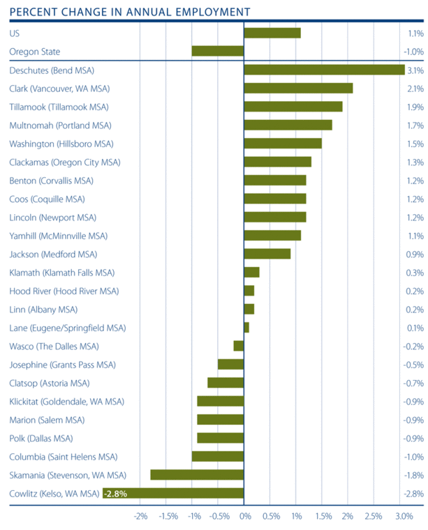 On an annualized basis, the Oregon counties covered by this report increased employment by one percent, or approximately 17,182 jobs. As was discussed in last quarter’s report, job growth remains positive; however, it is limping forward at an anemic pace. Year-over-year, 15 counties saw their employment base expand (down from 19 counties in our last report) and nine saw employment contracting.