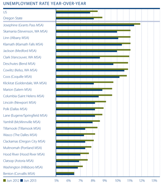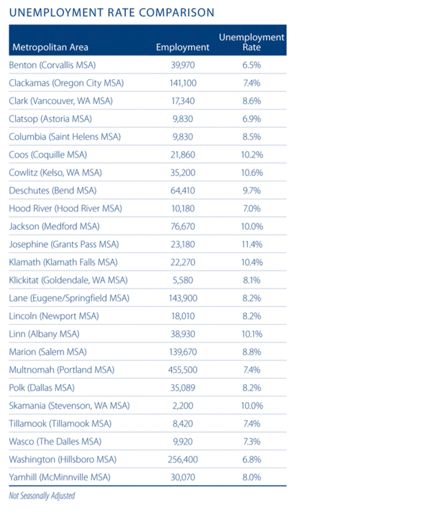 When compared to a year ago, the unemployment rate shrank in every county that was analyzed, other than in Benton County, where it remained at 6.5 percent. This is certainly positive; however, I remain concerned by the fact that there are still seven counties where the unemployment rate remains above 10 percent. As mentioned earlier, these are all more rural counties with employment averaging just over 30,000. It speaks to the dichotomy that exists within Oregon and is something that needs to be addressed.