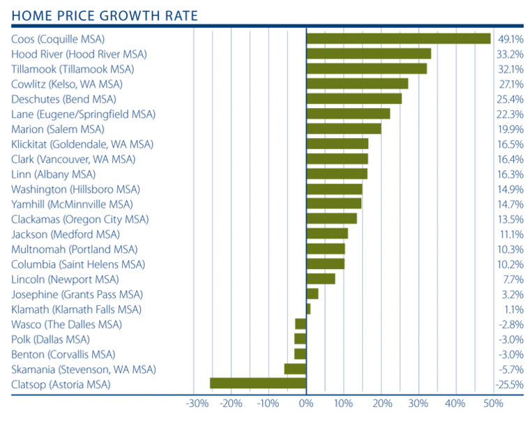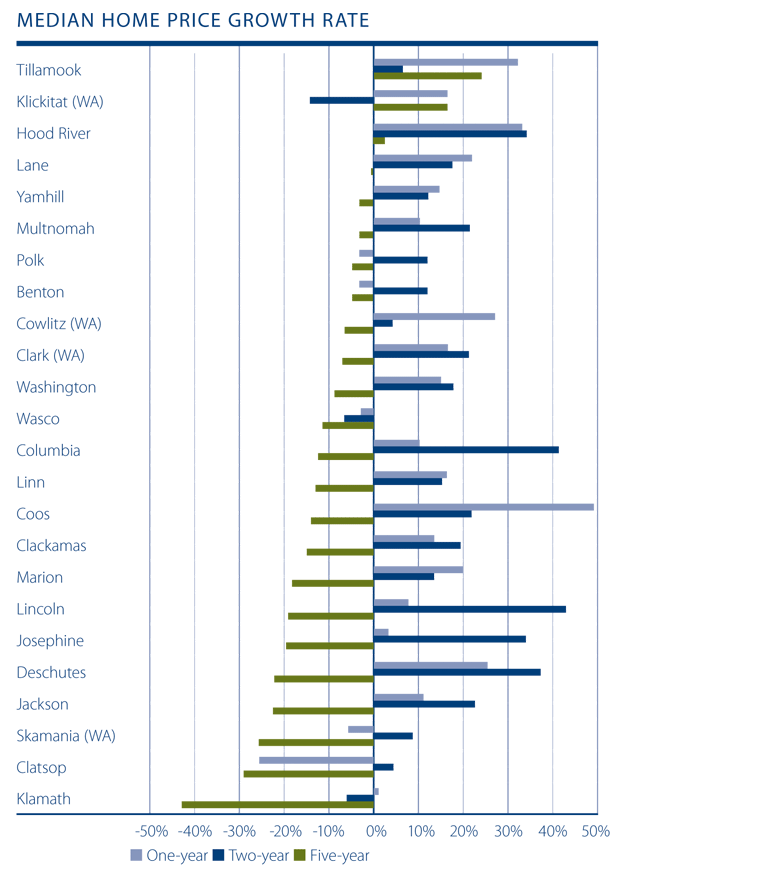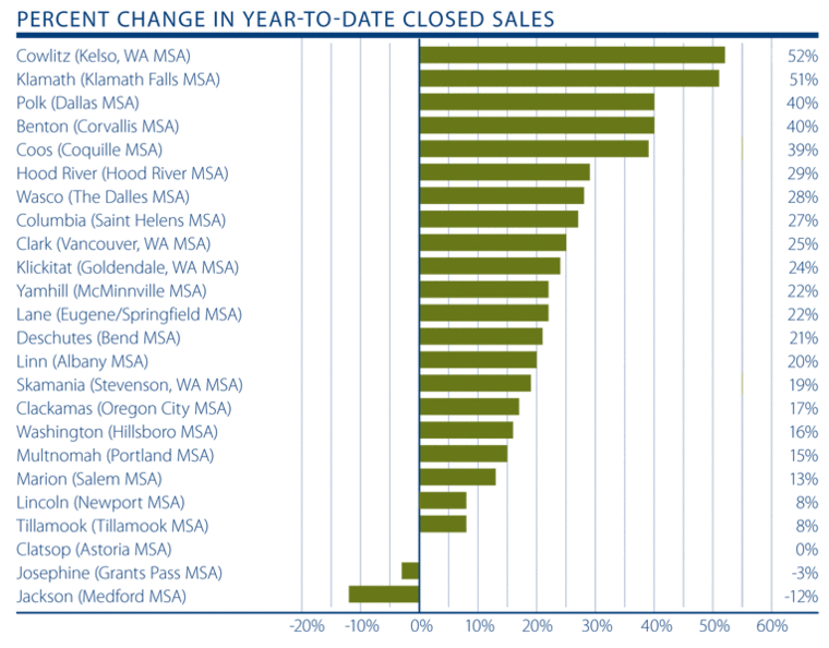 Of the markets where prices went down, the declines were most pronounced in Clatsop County, but that is a market which is prone to substantial swings. Prices shrank modestly in Skamania (-5.7%), Benton and Polk (-3%), and Wasco (-2.8%) Counties.