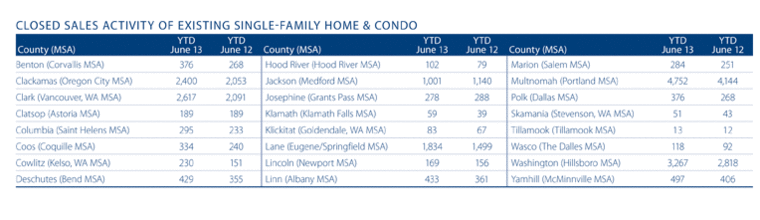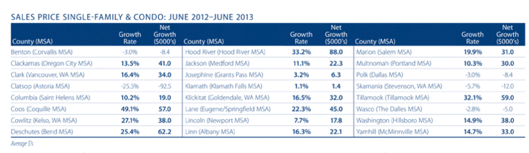 The greatest growth in transactions was again seen in Cowlitz County (+52%), and this was followed by Klamath (+51%), Polk and Benton (+40%), and Coos (+39%) Counties. There were just two counties that saw home sales drop when compared to the first half of 2012, with Jackson and Josephine Counties dropping by 12 and three percent, respectively.