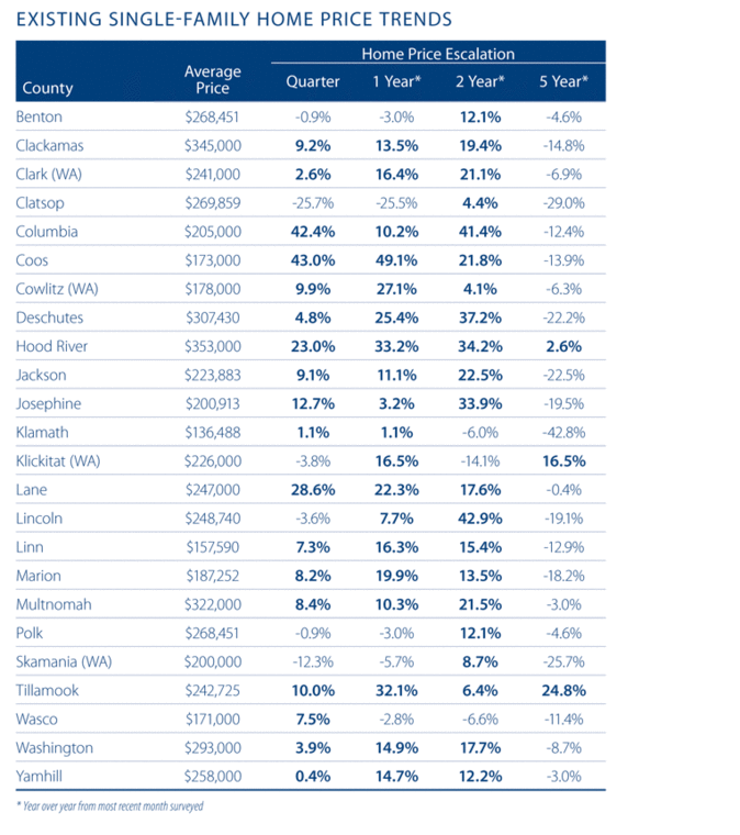 Relative to the previous quarter, 18 counties saw prices rise and six experienced declines. Countering our last report, where there was a dramatic increase in sale prices in Clatsop County, this time prices dropped by an equally remarkable 26 percent. This is a very small county and therefore prone to wild fluctuations. On the positive side of the equation, substantial growth was seen in Coos (+43%), Columbia (+42.4%), Lane (+28.6%), and Hood River (+23%) Counties.