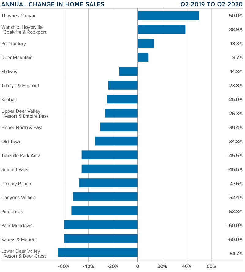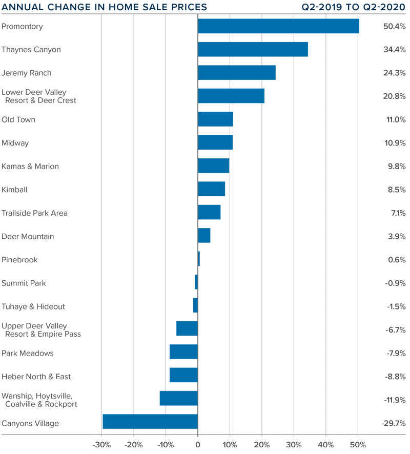 ❱ Prices rose in a majority of neighborhoods, with significant gains in the Promontory, Thaynes Canyon, Jeremy Ranch, and Lower Deer Valley Resort & Deer Crest neighborhoods. Annual sale prices dropped in seven markets, with the Canyons Village area experiencing the steepest decline.