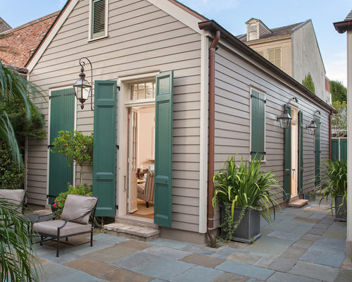 A soft tan or taupe is a popular, tried-and-true exterior color that happens to make a terrific background hue to a more unusual accent color, such as this deep, elegant green.