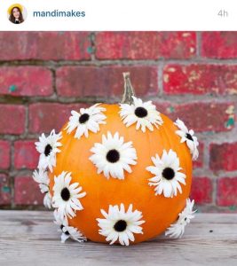 Floral Fun – Use a drill or nail wide enough to poke holes through for stems of flowers and cover pumpkin in them. Use flowers with your favorite fall colors: yellows, oranges, and reds. For a more dainty look, use white daisies.