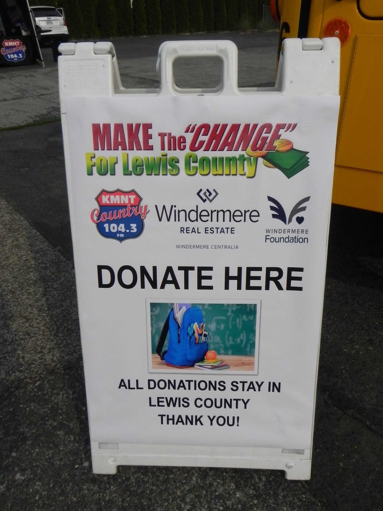 Centralia, WA: On August 21, the Windermere Centralia office teamed up with KELA/KMNT Radio to host the Make The “Change” For Lewis County fundraising event. A school bus was parked next to the Windermere office to collect school supplies, checks, cash or change, and KELA/KMNT Radio was on site broadcasting live from the event. Over $2,000 worth of school supplies were collected for Lewis County schoolkids in need.