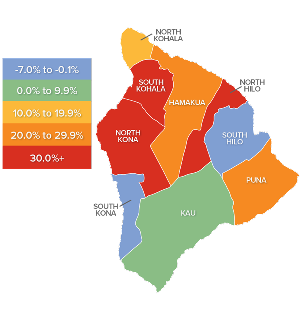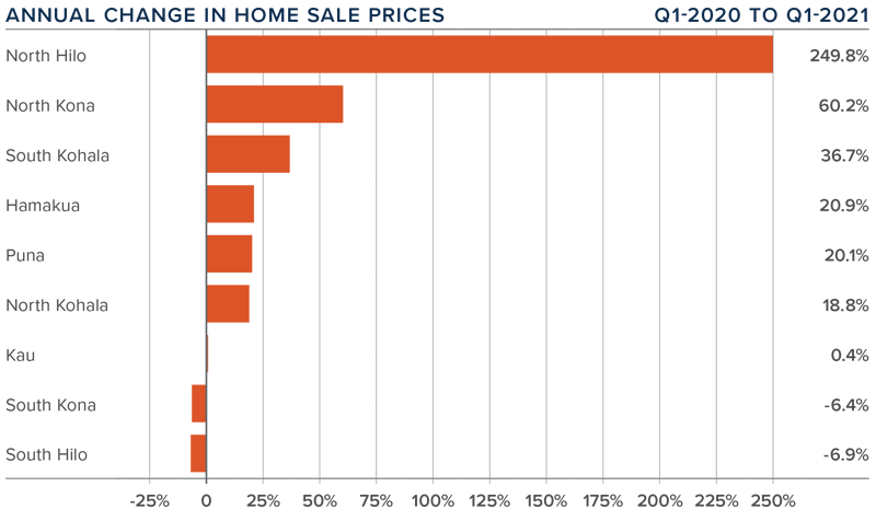 ❱ The substantial increase in prices was driven by significant price growth in North Hilo, where the average sale price rose from $248,000 to $866,000. Six additional markets saw prices increase by double-digits.