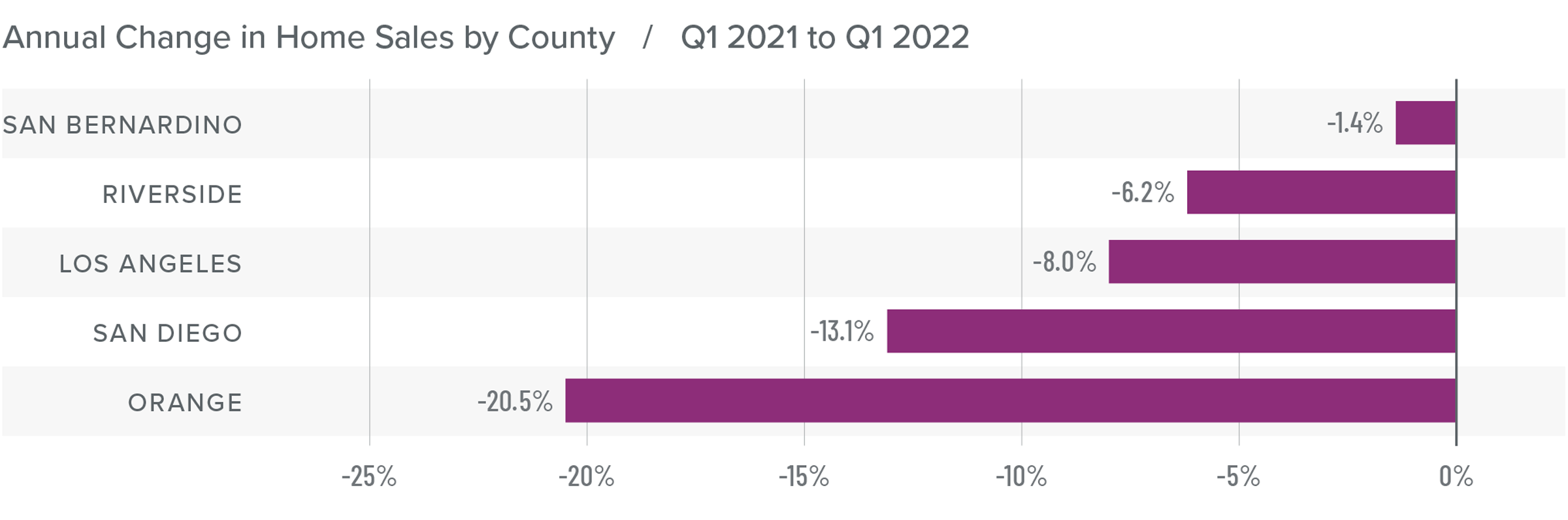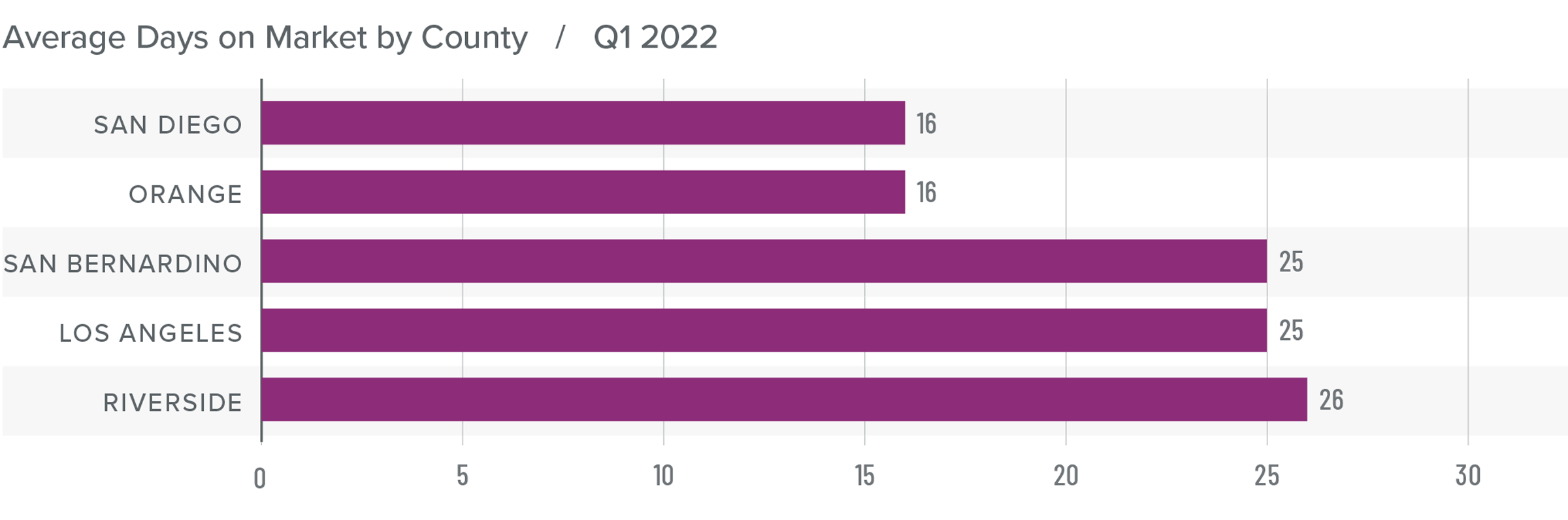 ❱ The other four counties also saw the time it took to sell drop compared to a year ago, but market time rose very modestly in Riverside, Los Angeles, and San Bernardino counties compared to the fourth quarter of 2021.