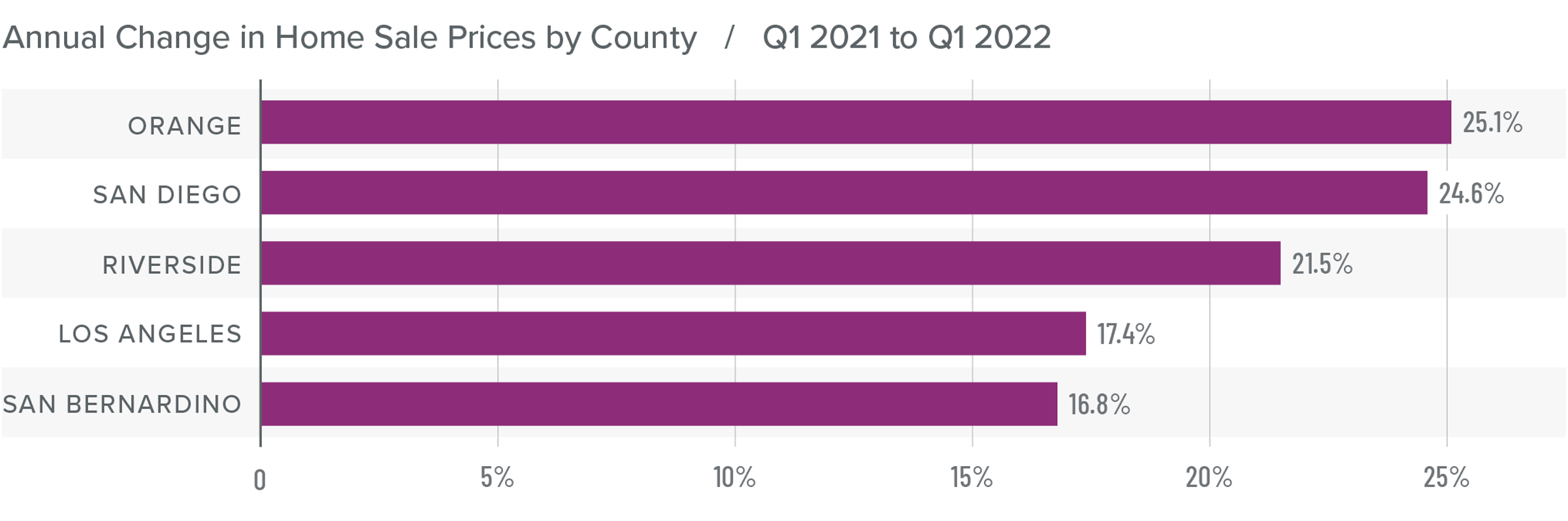 ❱ The region saw double-digit price growth across the board, with Orange County again leading the way. Of note is that home prices in Riverside County rose 10.7% compared to the prior quarter.