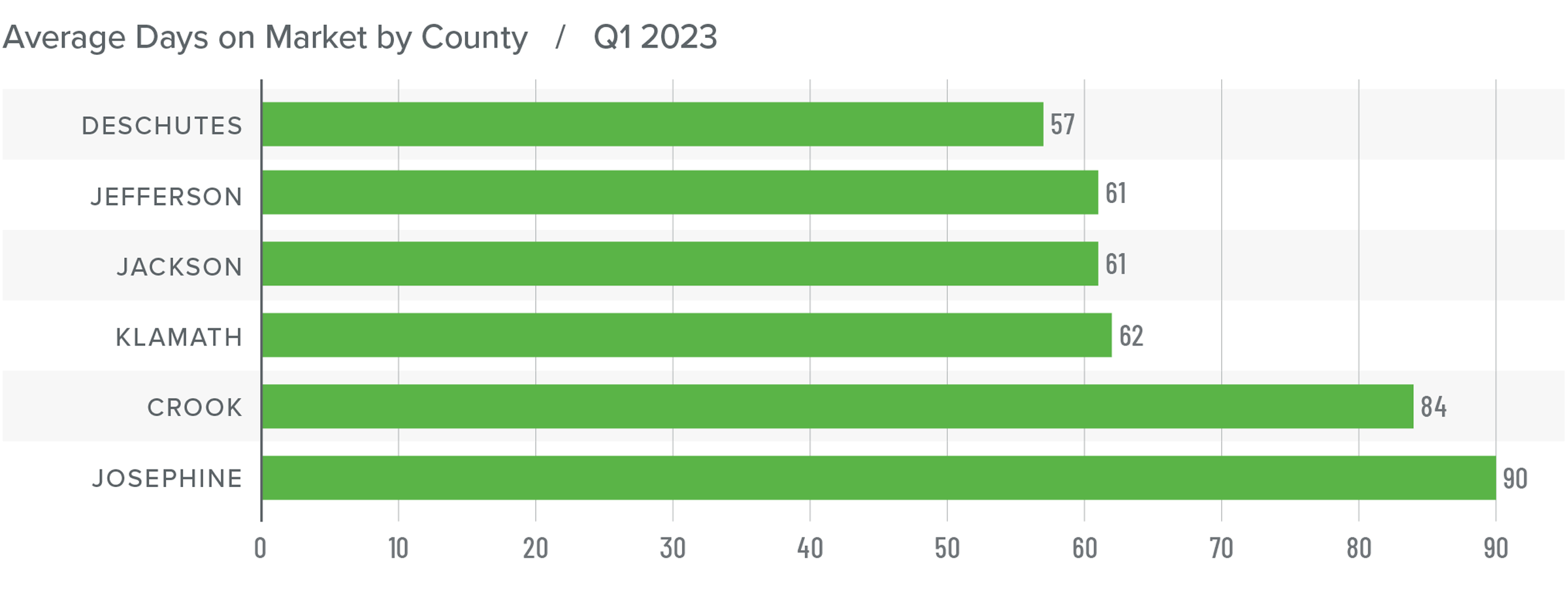 ❱ Median listing prices rose in Crook, Deschutes, Jackson, and Klamath counties, but fell in the other two counties compared to the fourth quarter of 2022. It appears the overall market has not found equilibrium yet.