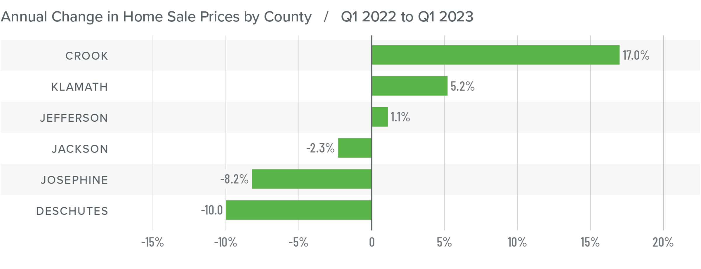 ❱ Compared to the final quarter of 2022, home prices rose in Crook and Jackson counties, but fell in the rest of the market areas.