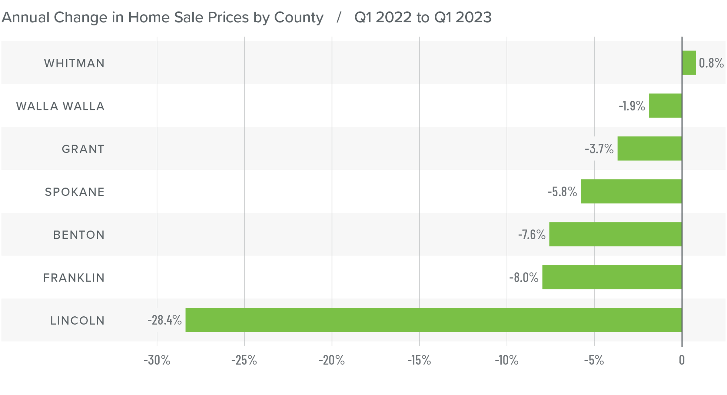 ❱ Every county except Whitman saw average sale prices fall compared to the first quarter of 2022, with a significant drop in Lincoln County.