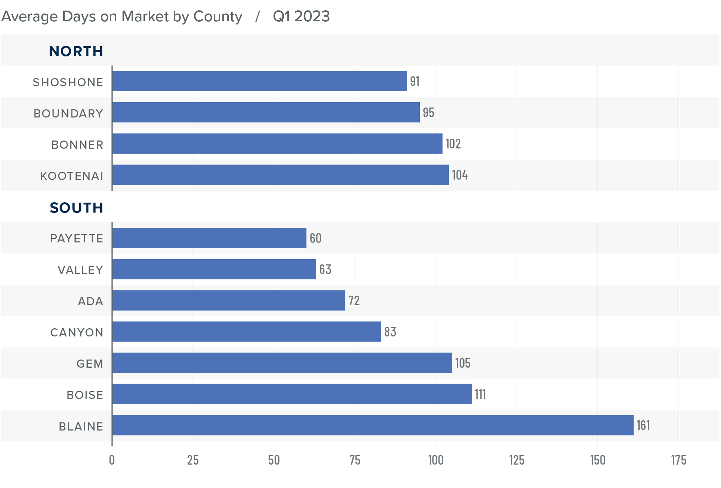 ❱ In both Northern and Southern Idaho, days on market rose in all counties compared to the same period in 2022. Compared to the fourth quarter of 2022, market time rose in every county other than Gem County in Northern Idaho.