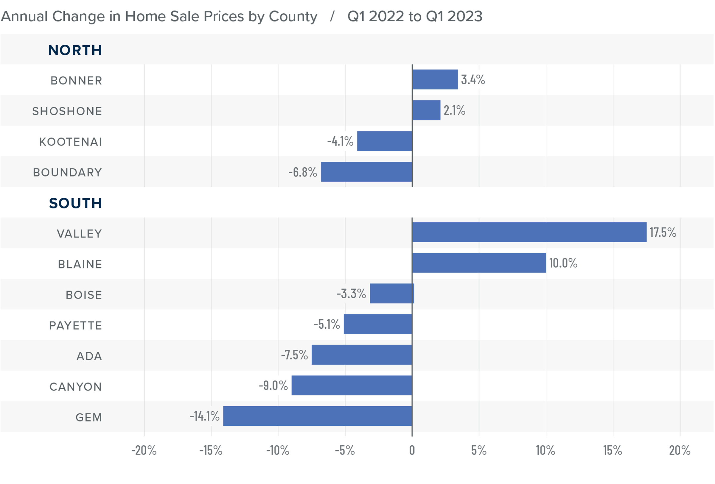 ❱ Compared to the fourth quarter of 2022, prices only increased in Shoshone County. In the southern part of the state, prices rose in Valley, Payette, Gem, Boise, and Blaine counties.