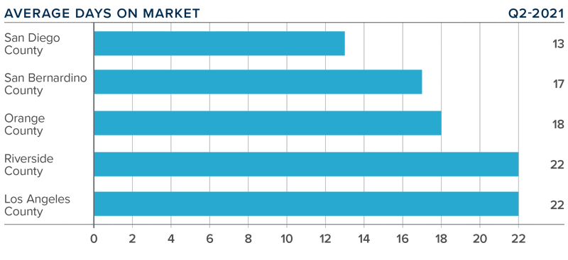 ❱ Homes in San Diego County continue to sell at a faster rate than other markets in the region. In the second quarter, it took an average of only 13 days to sell a home there. This is 9 fewer days than it took a year ago.