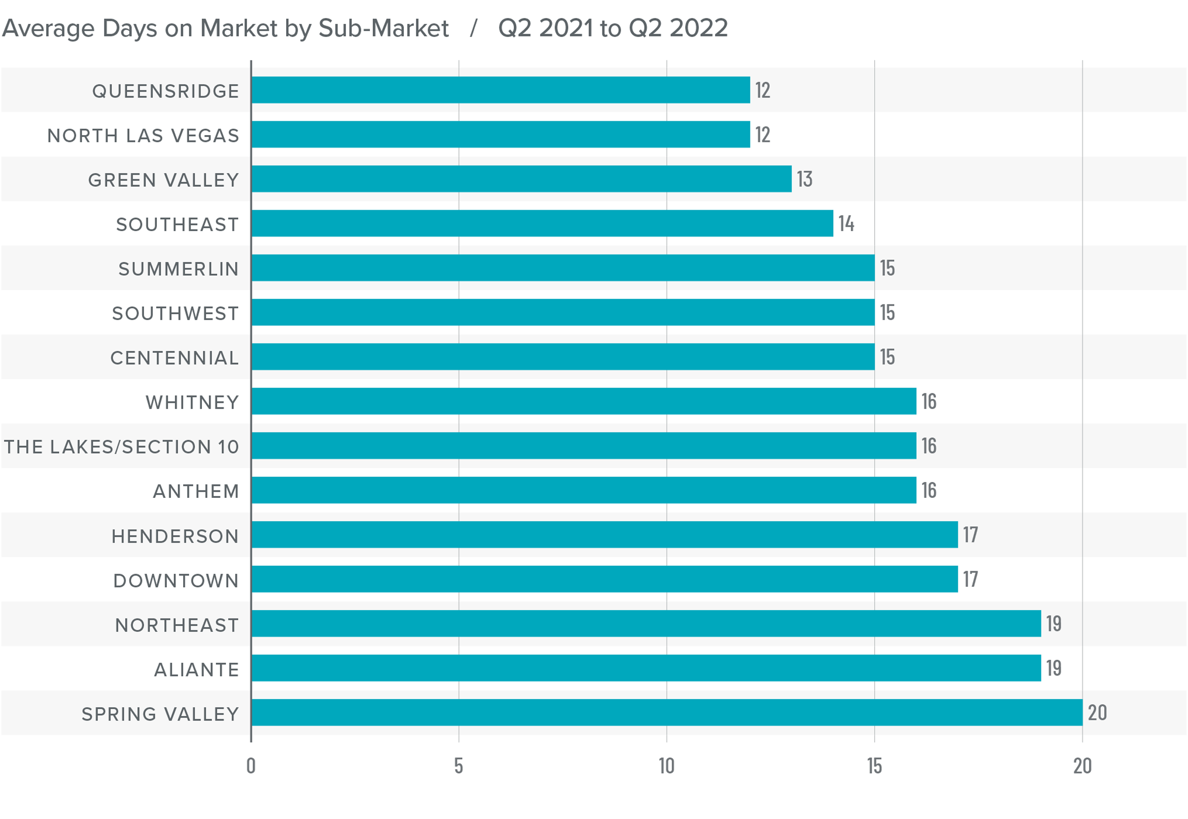 ❱ Days on market dropped in all neighborhoods except Anthem compared to the same period a year ago. Market time dropped in all neighborhoods other than Northeast Las Vegas (where it remained static) compared to the first quarter of the year.