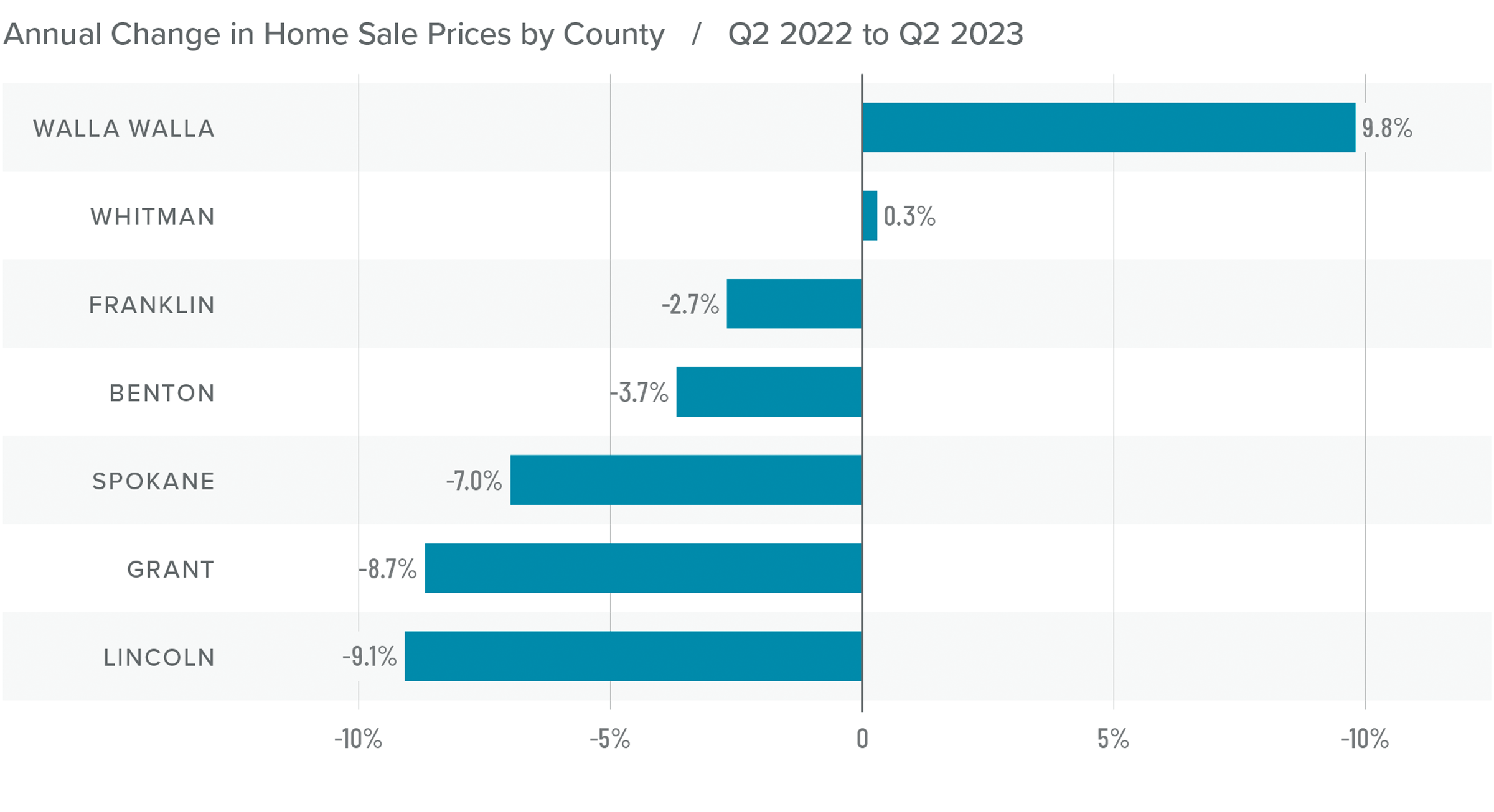 ❱ Every county except Walla Walla and Whitman saw average sale prices fall compared to the second quarter of 2022. This decline was modest and not surprising given that prices peaked in the second quarter of last year when mortgage rates started to rise.