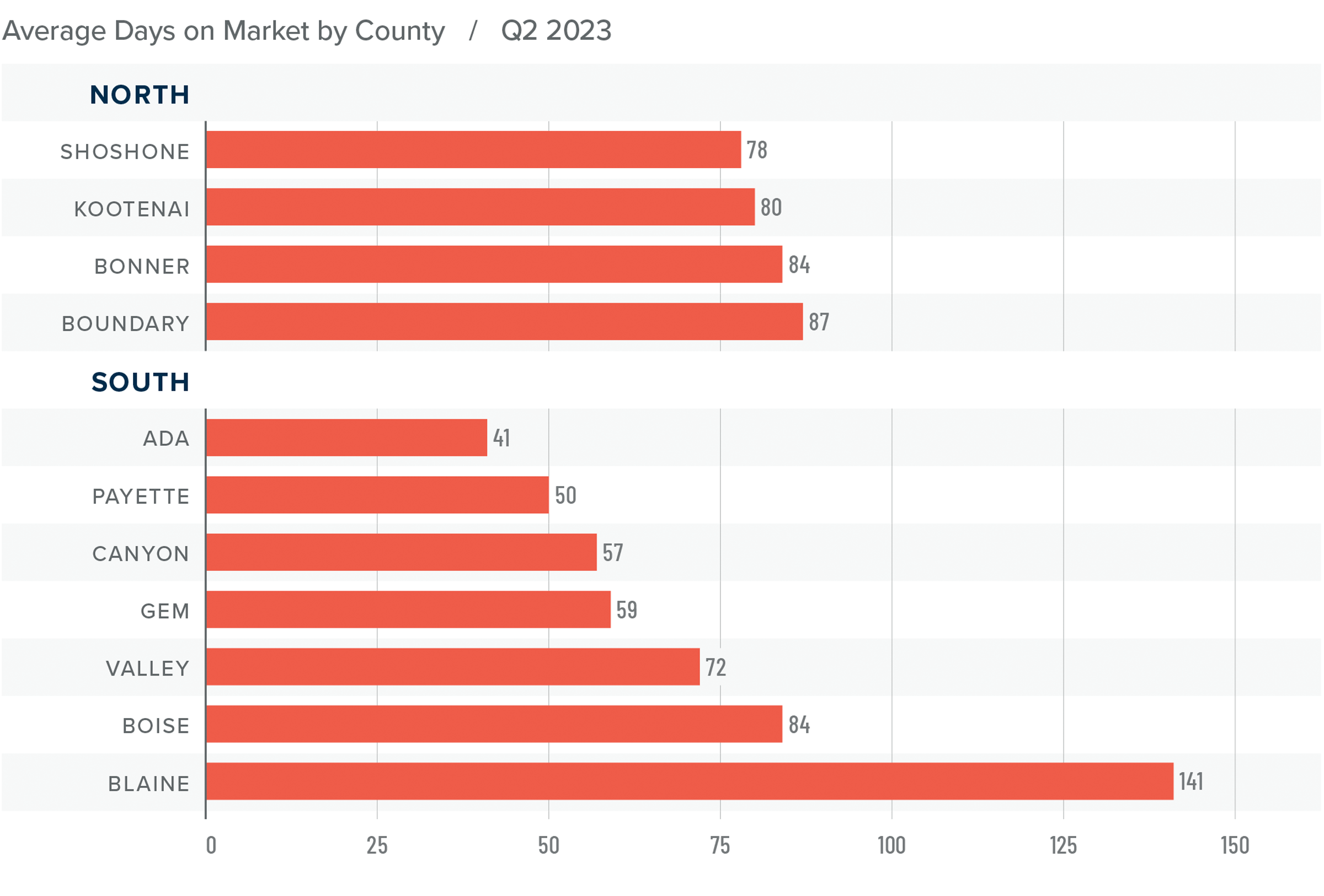 ❱ In all Northern and Southern Idaho counties, days on market rose compared to the same period in 2022. But compared to the first quarter of this year, market time fell in every county other than Valley.