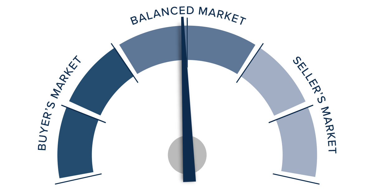 This speedometer reflects the state of the region’s real estate market using housing inventory, price gains, home sales, interest rates, and larger economic factors.