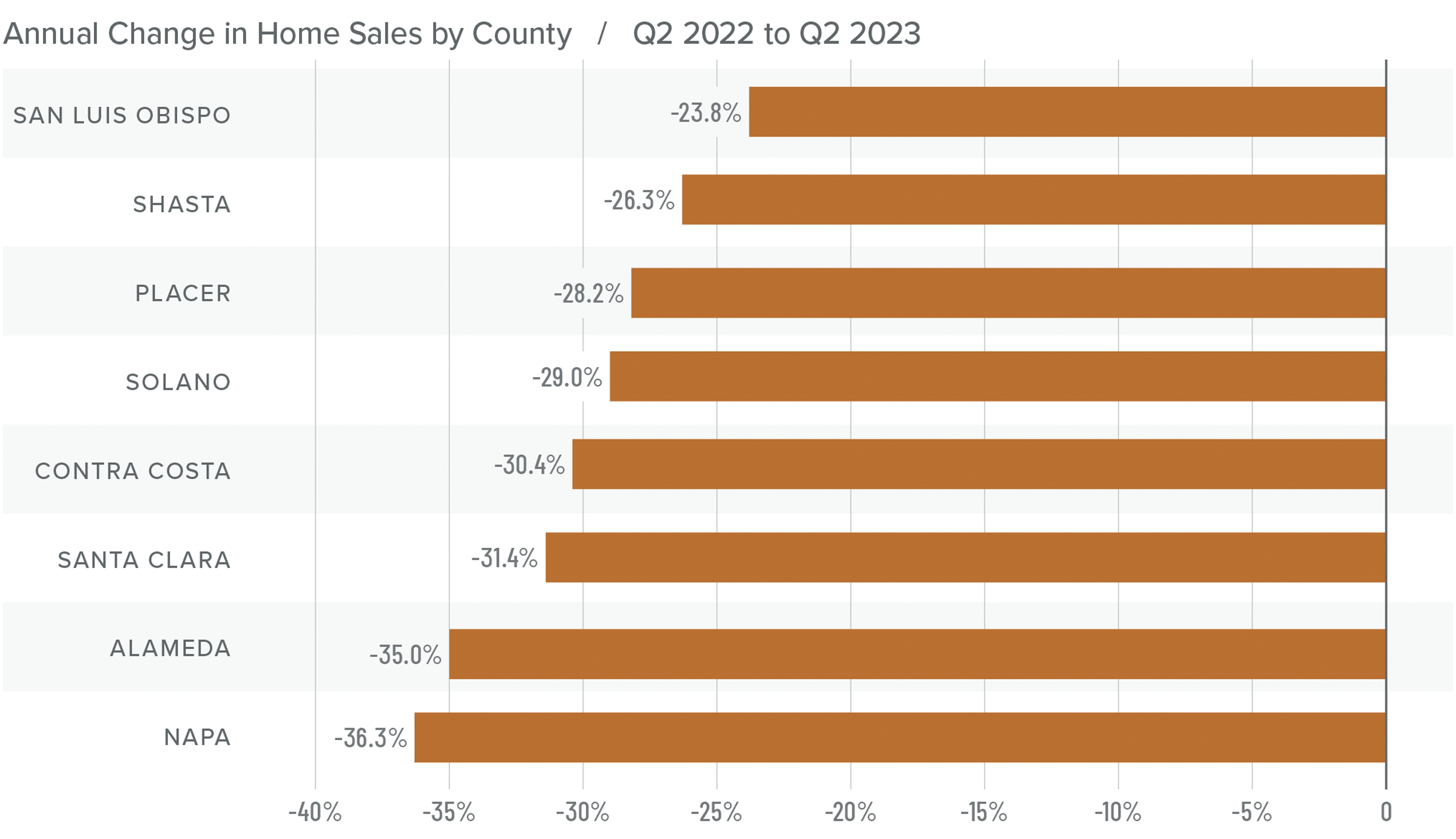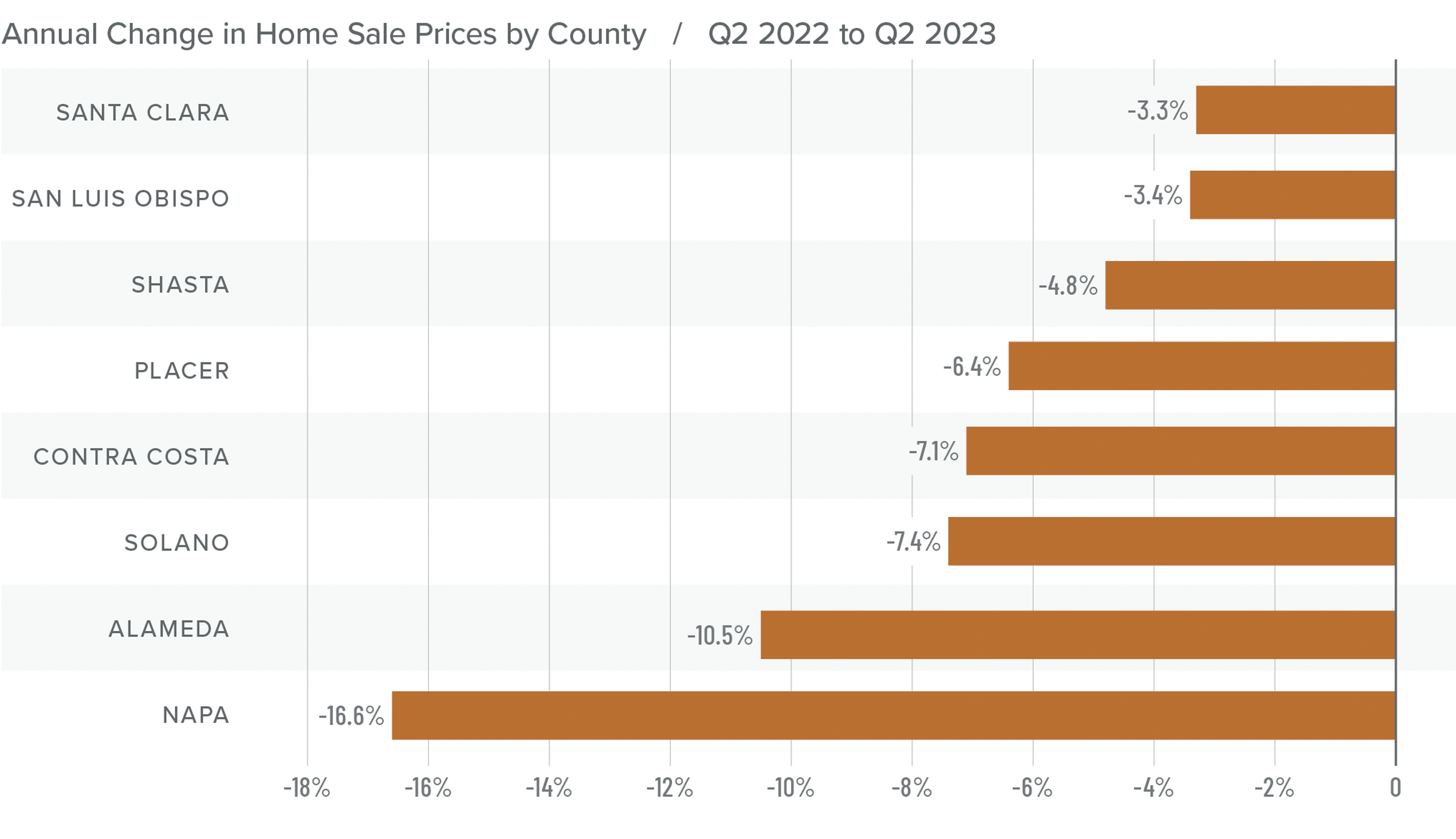 ❱ Prices fell across the board from the second quarter of 2022, with double-digit drops in Napa and Alameda counties. Compared to the first quarter of 2023, sale prices were higher in all market areas, with double-digit growth in Alameda, Contra Costa, Napa, and Santa Clara counties.