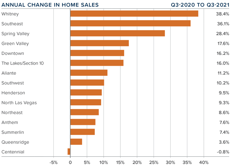 ❱ Sales rose in every neighborhood other than Centennial, but the drop there was minor. Transactions rose the most in the Whitney and Southeast Las Vegas market areas, but six additional neighborhoods also experienced double-digit growth.