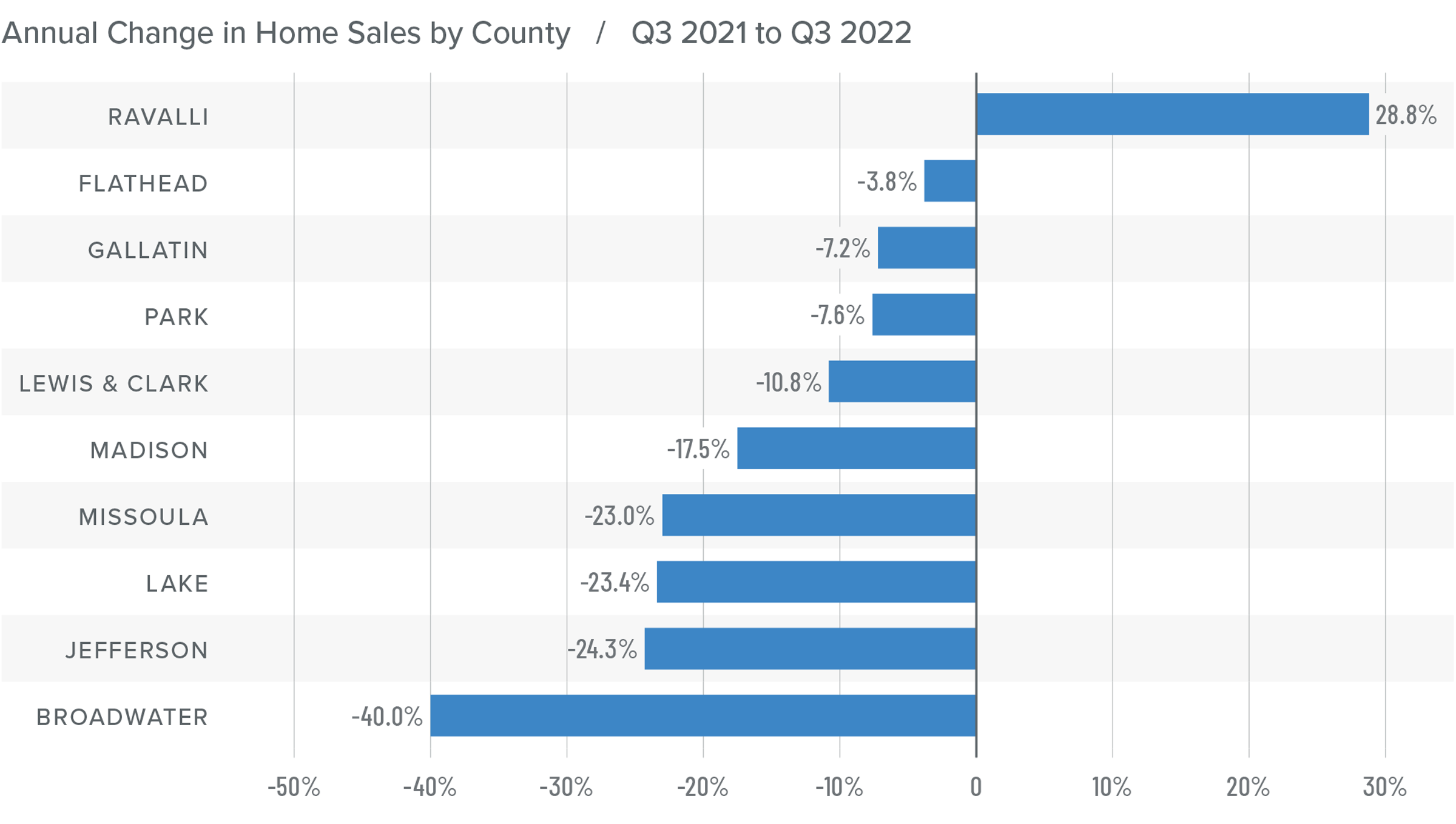 ❱ Year over year, sales grew in Ravalli County but fell in the balance of the markets included in this report. Sales grew in Missoula, Ravalli, and Lake counties from the second quarter but fell in all other markets.