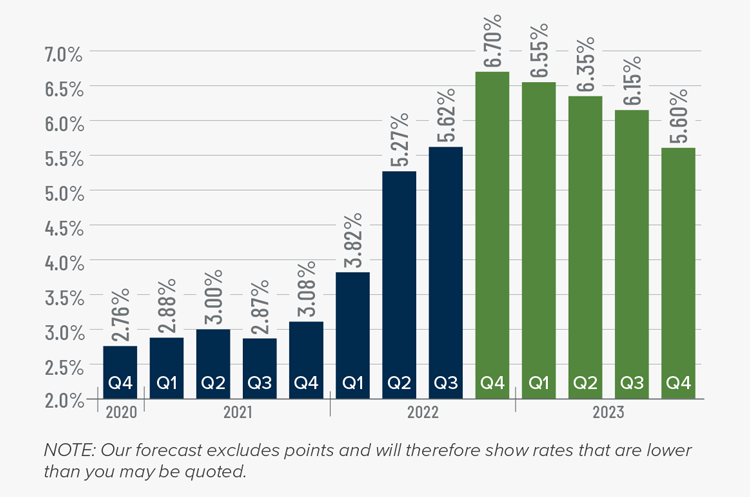 As a result, mortgage rates are out of sync with treasury yields, which not only continues to push rates much higher, but also creates violent swings in both directions. My current forecast calls for rates to peak in the fourth quarter of this year before starting to slowly pull back. That said, they will remain in the 6% range until the end of 2023.