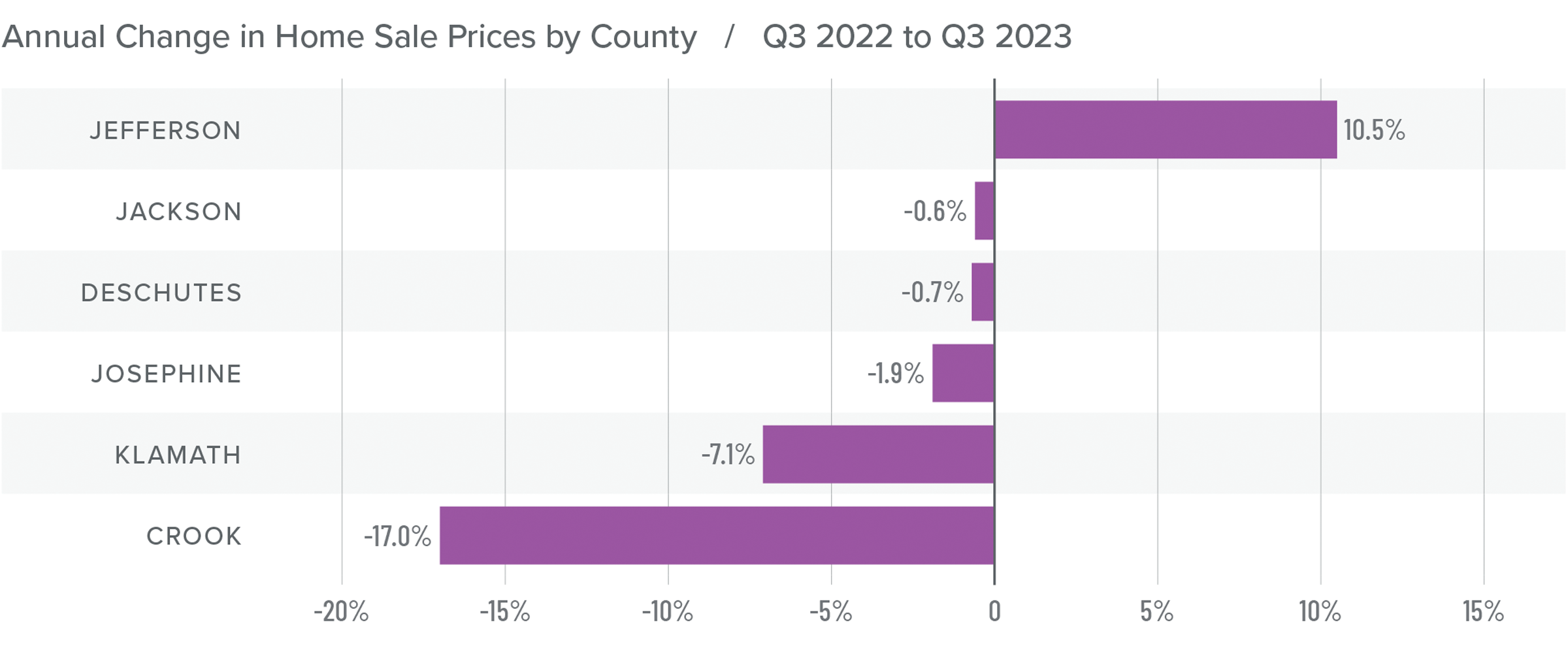 ❱ Compared to the second quarter of this year, average prices rose in Deschutes, Jackson, Jefferson, and Josephine counties but fell in Crook and Klamath counties.