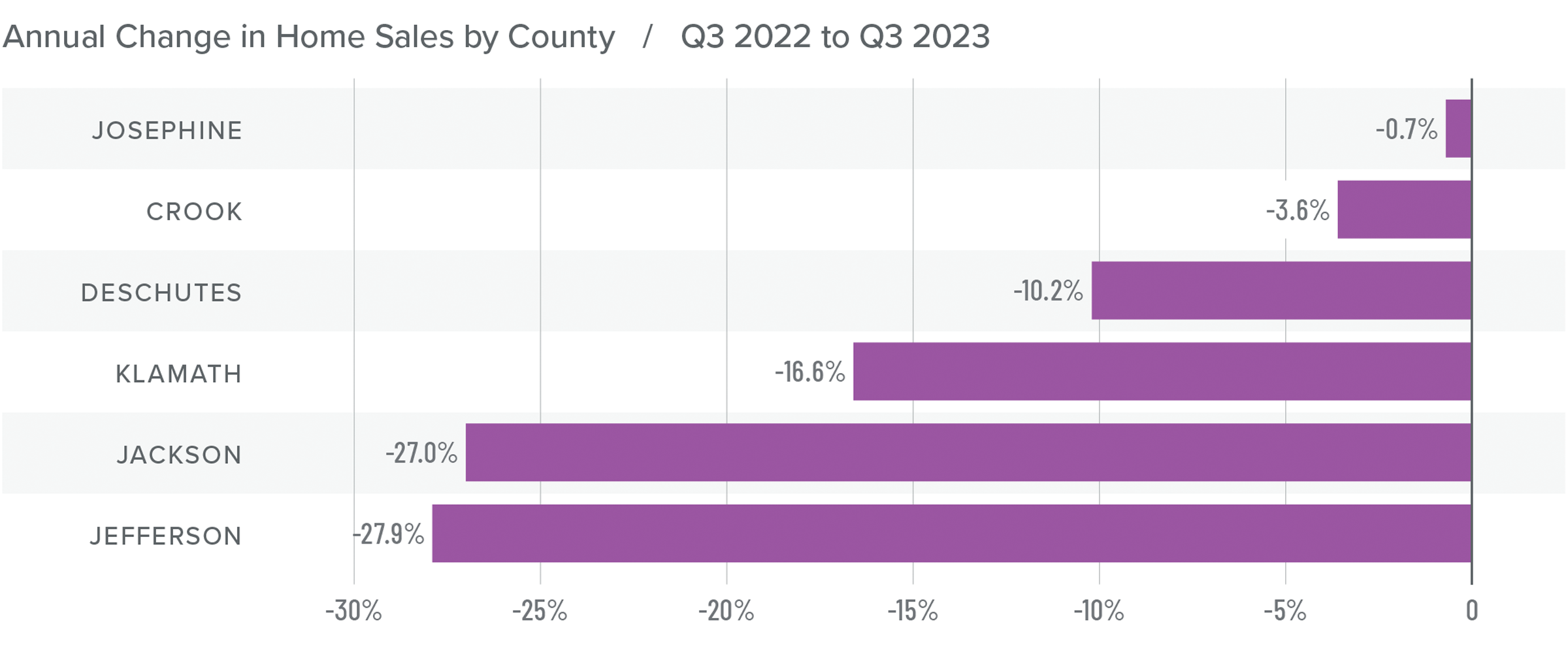 ❱ Sales fell across the board in all counties compared to the third quarter of 2022, with significant declines in all markets except Crook and Josephine counties.