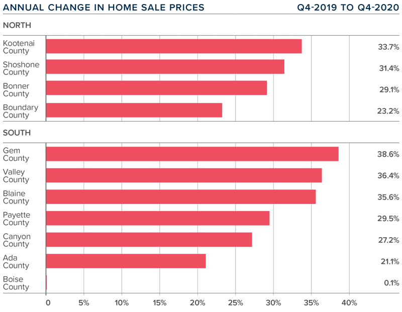 ❱ In Northern Idaho, prices rose significantly in Kootenai County, but all counties saw double-digit gains. Southern Idaho price growth was equally impressive, with Blaine County standing out with an average home sale price over $1.2 million.
