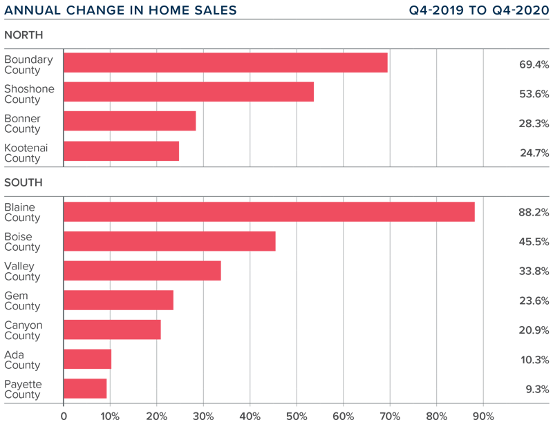 ❱ In Northern Idaho, days on market dropped in all counties other than Shoshone, where market time rose by 19 days. In Southern Idaho, market time dropped in all counties other than Blaine, where it took 25 more days to sell a home than in the final quarter of 2019.
