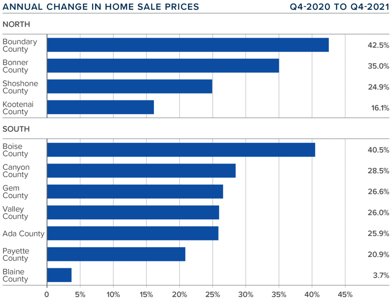 In-migration to Idaho has been impressive. Much of this has been driven by the ability for employees to continue working remotely. For many workers leaving more expensive markets, price points in Idaho are a major draw. Although mortgage rates will continue to climb higher in 2022, my forecast calls for home prices in Idaho’s southern counties to see low double-digit percentage gains while the northern part of the state can expect increases in the high teens. Good news for sellers, but buyers will likely not be so happy.