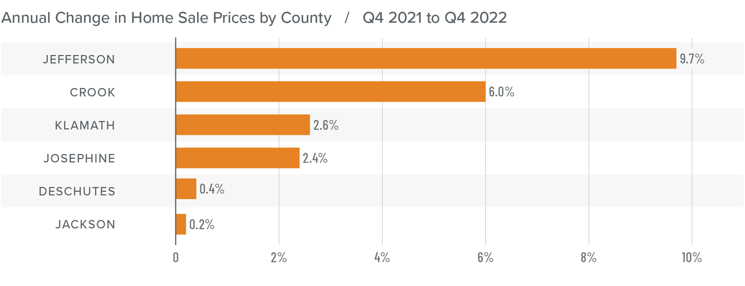 ❱ Compared to the third quarter, median listing prices fell in Deschutes, Jackson, Crook, and Josephine counties, but rose in Klamath and Jefferson counties.