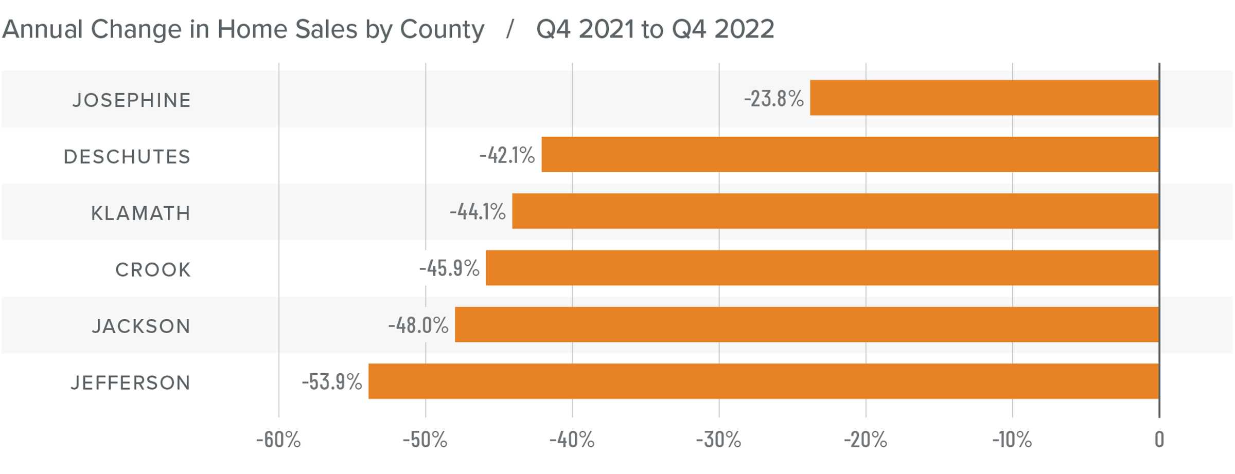 ❱ Home sales fell in all counties relative to the third quarter of 2022. Only Josephine County saw a decline in sales of less than 10%.