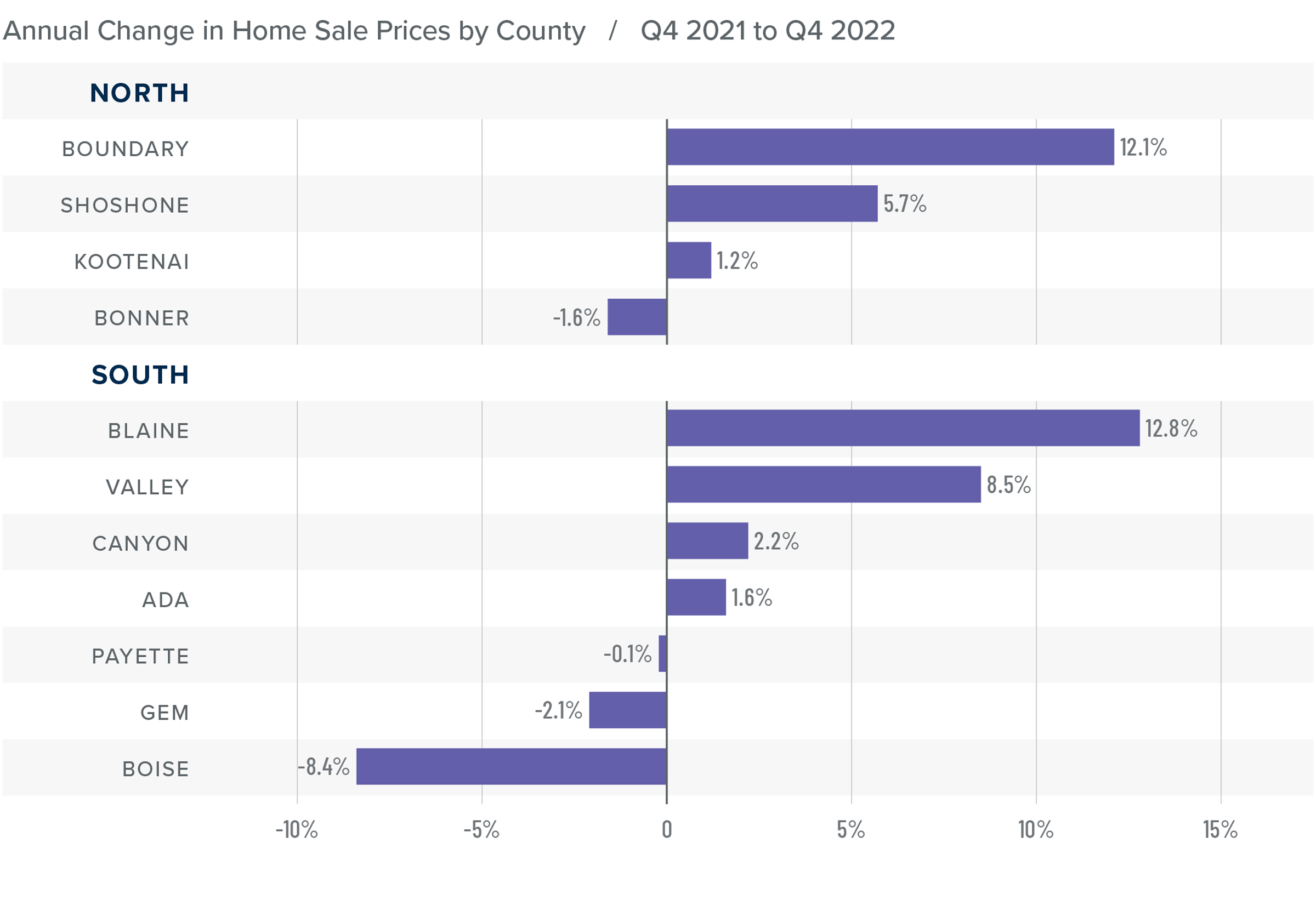 ❱ Year over year, prices rose by double digits in Boundary County and were higher in all Northern Idaho counties except Bonner. In the southern part of the state, prices rose in four counties but fell in Payette, Gem, and Boise counties.