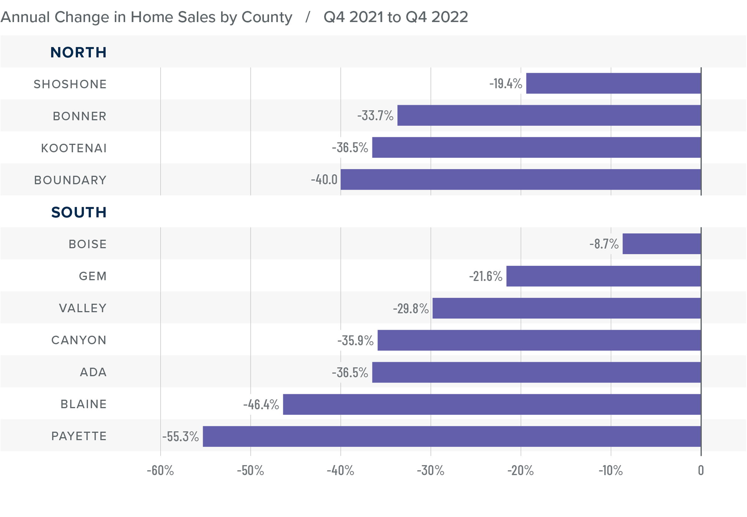 ❱ Compared to the same period a year prior, sales fell in all markets covered by this report. Relative to the third quarter of 2022, sales rose in all Northern Idaho markets but fell in every southern market other than Gem County.
