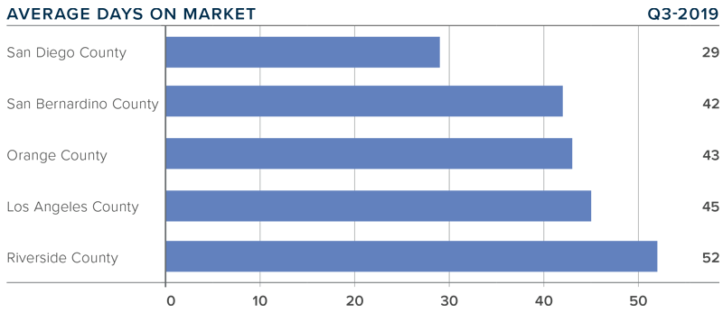 - Homes in San Diego County continue to sell at a faster rate than other markets in the region. In the second quarter, it took an average of 29 days to sell a home. This is only 2 more days than it took a year ago.