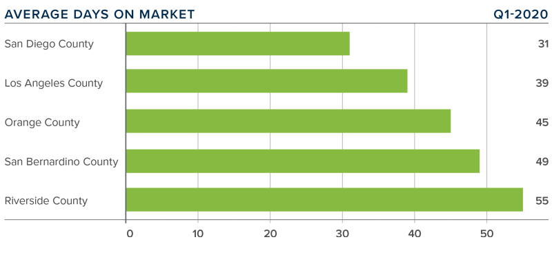 - Homes in San Diego County continue to sell at a faster rate than other markets in the region. In the first quarter of 2020, it took an average of 31 days to sell a home there — 6 fewer days than it took a year ago.