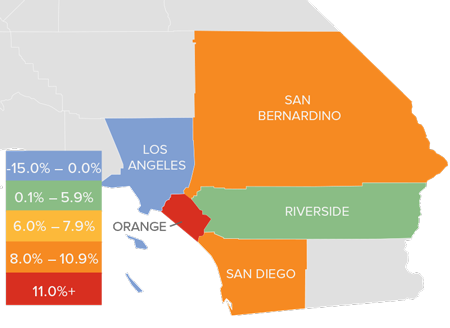 - Prices were higher in all counties contained in this report except Los Angeles County. Orange County saw significant price growth.