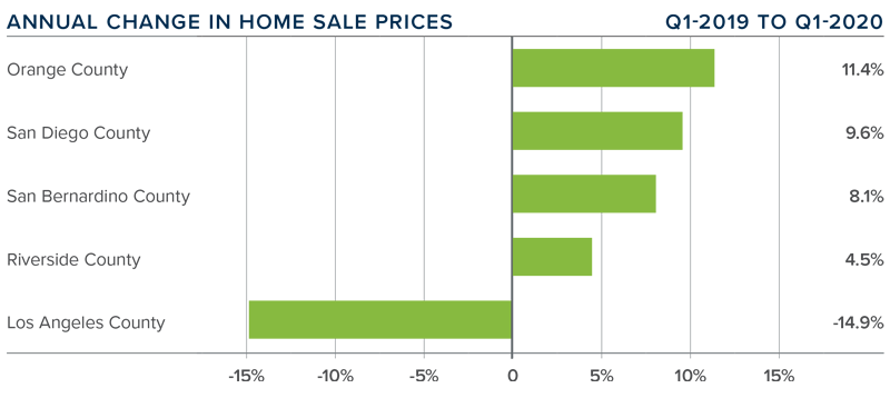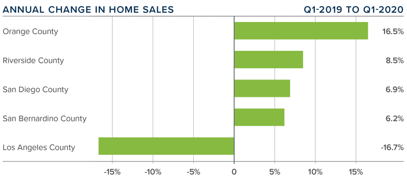 - First quarter home sales rose in all counties contained in this report other than Los Angeles County. Notably, Orange County experienced a significant increase: more than 840 more units changed hands than in the first quarter of 2019.