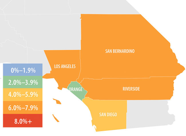 - San Bernardino County saw the greatest annual appreciation in home values (+7.7%). This was followed by Riverside County, where the average price rose 7.2% year-over-year.