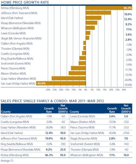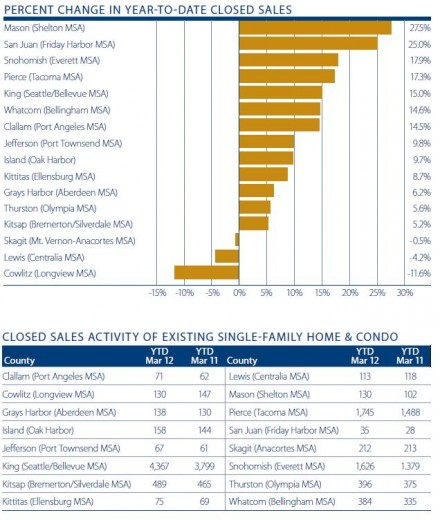 Our market reported 10,136 sales of existing homes in the first quarter of this year—an impressive increase of 13.7 percent from the first quarter of 2011. The most pronounced gains were seen in Mason (+27.5%), San Juan (+25%), Snohomish (+17.9%), Pierce (+17.3%), and King (+15%) Counties.