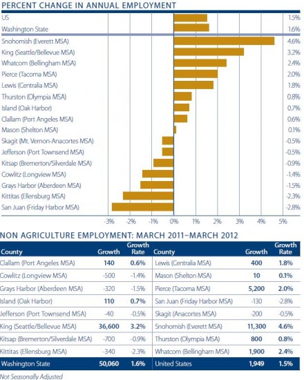 Between March of 2011 and March of 2012, the markets considered in this report added a very impressive 54,230 jobs—a 2.58 percent growth rate, which far exceeds that of Washington State as a whole, or even the United States average. As the charts to the right indicate, nine counties expanded their employment base with just seven shrinking. When I compare this to our last report where just six counties expanded while ten contracted, it is clearly a better picture.