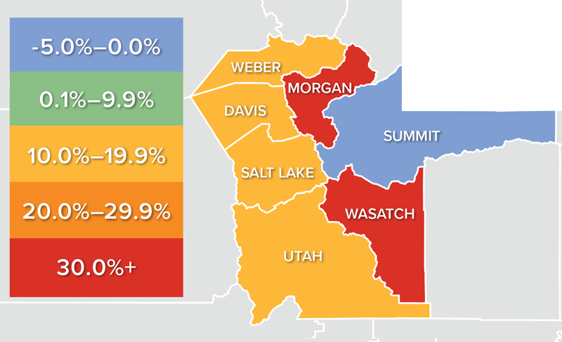 - Wasatch County experienced solid price growth. Average sale prices there rose by 46%, which is largely a function of it being a relatively small county. Interestingly, average sale prices fell in Summit County—again, due to its small market size.