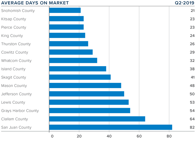- Snohomish County was the tightest market in Western Washington, with homes taking an average of only 21 days to sell. There were five counties where the length of time it took to sell a home dropped compared to the same period a year ago. Market time rose in eight counties and two were unchanged.