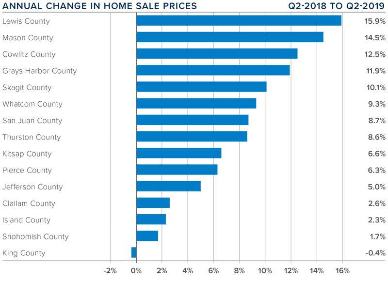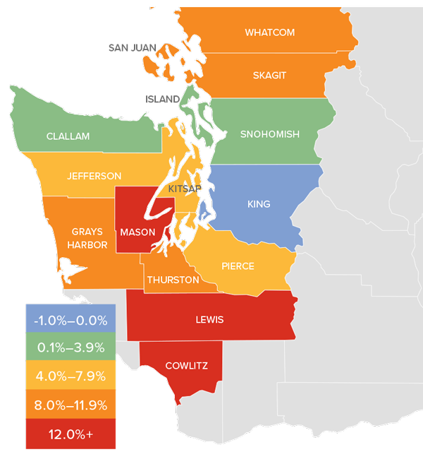 - When compared to the same period a year ago, price growth was strongest in Lewis County, where home prices were up 15.9%. Double-digit price increases were also seen in Mason, Cowlitz, Grays Harbor, and Skagit counties.
